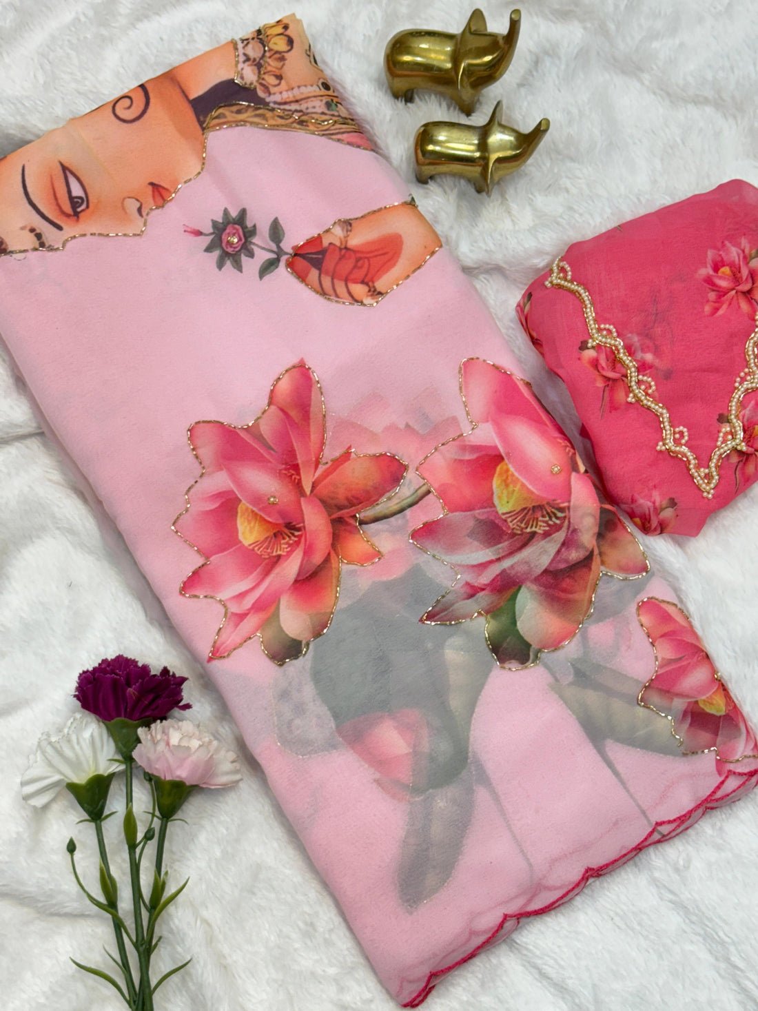 Soft & smooth weightless chiffon floral digital print with beautiful handwork and Arco lace borderBlouse...
