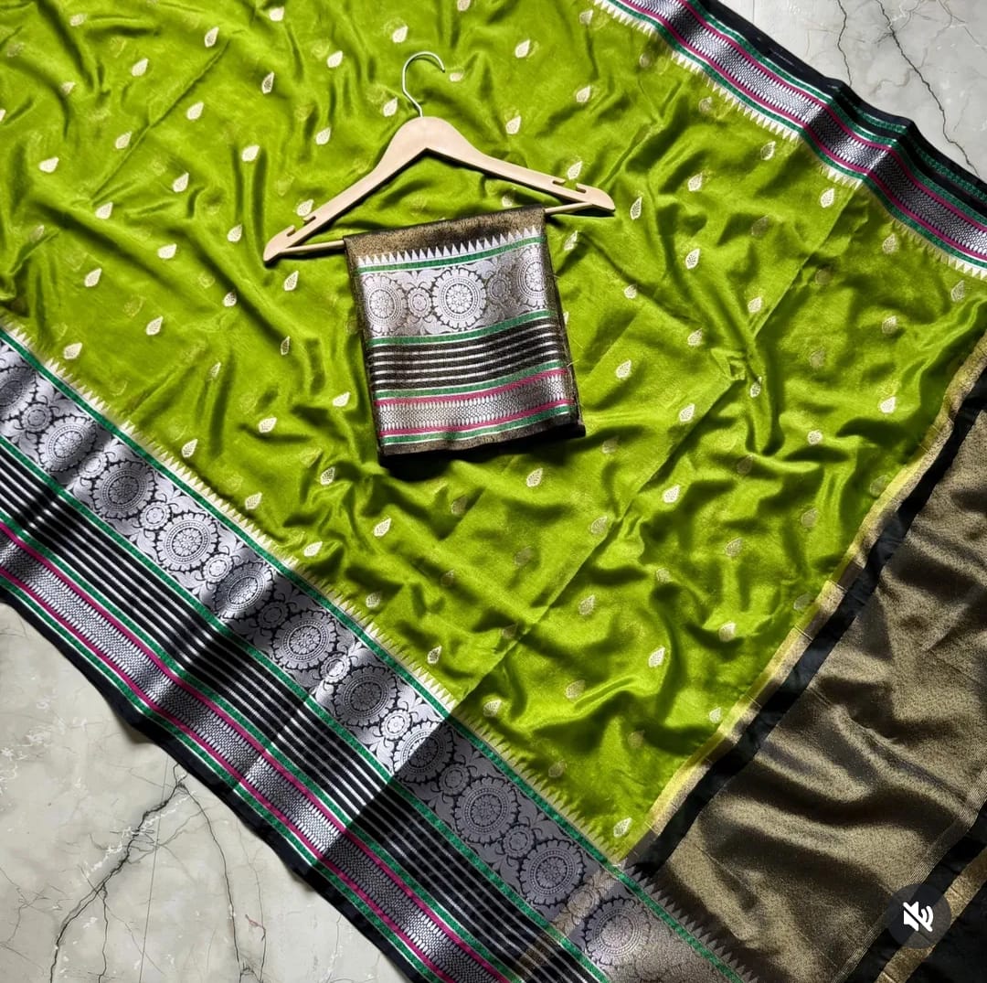 Experience the luxurious warmth of our Banaras warm silk soft saree. With a beautiful design border and fancy buti allover zari weaving, this saree is both elegant and comfortable to wear. The contrasting pallu and blouse pieces add a touch of sophistication. Elevate your style with this exquisite saree.