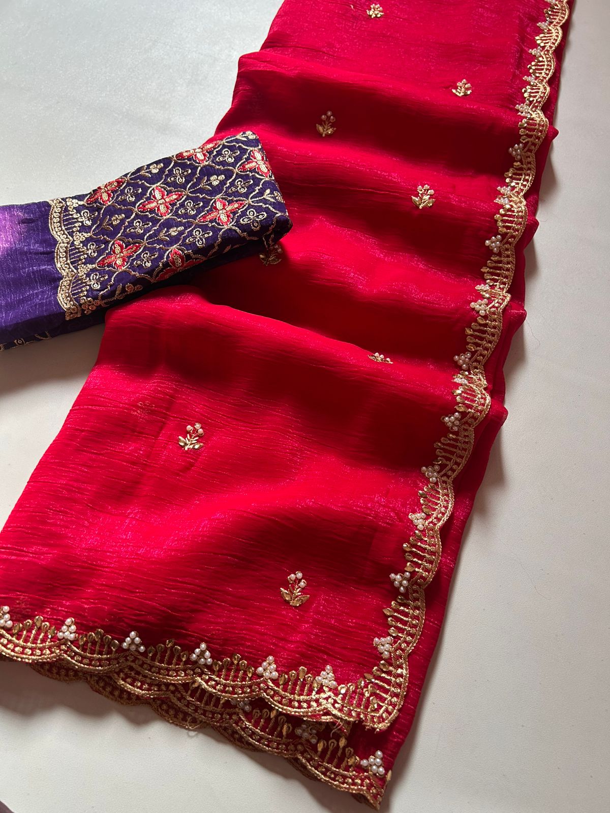 Crunchy chiffon crush silk with beautiful embroidery work scalloped cut work border