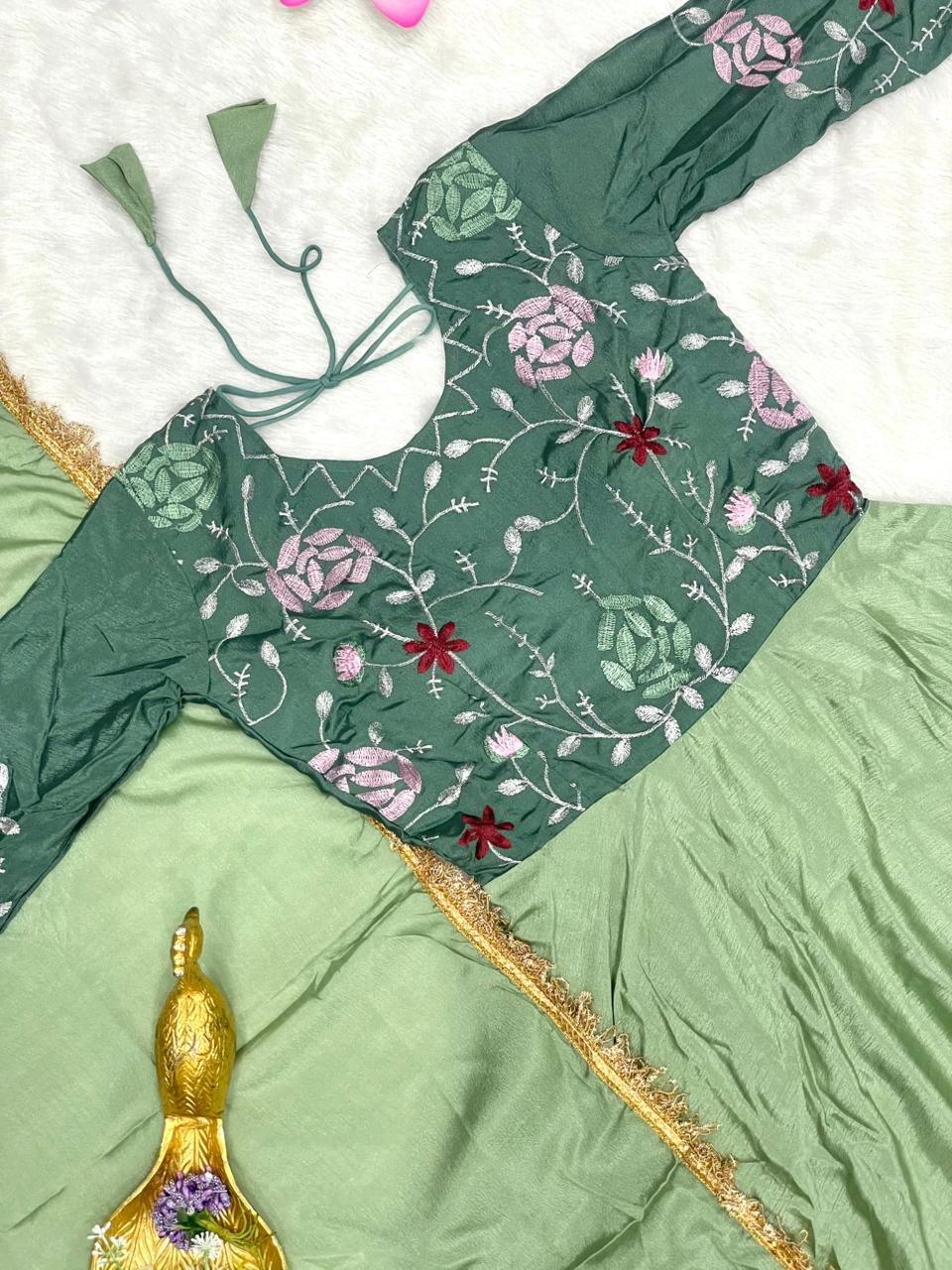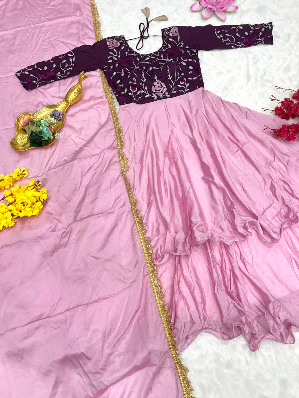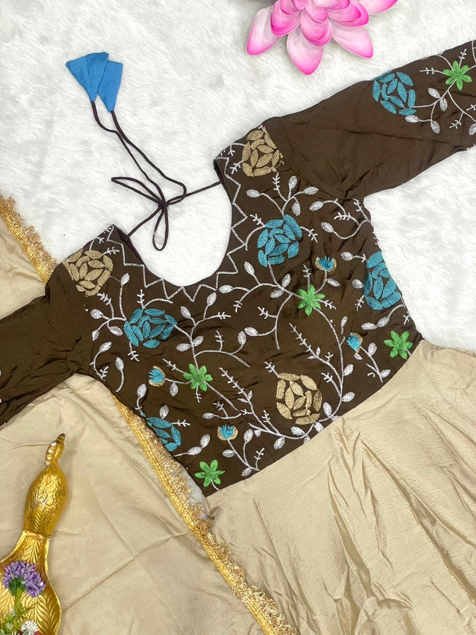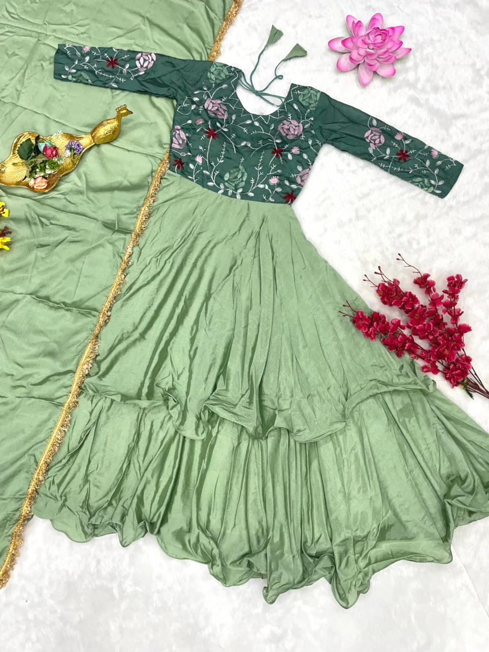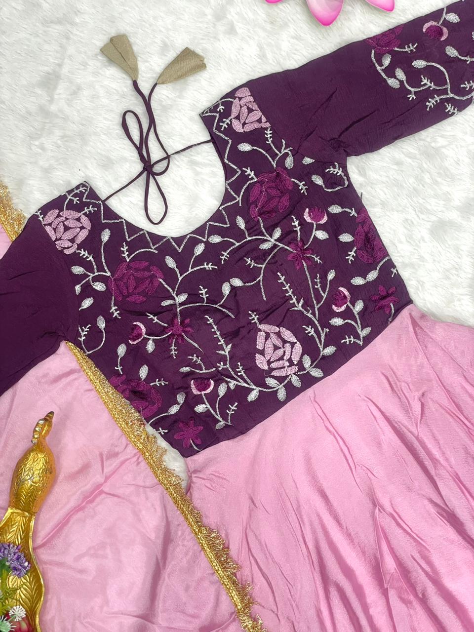 New Launching chinnon gown with embroidered border women's super collection with original modelling. Beautiful fully stitched designer gown with Embroidered border Dupatta for Festive Season...💜🧡🩷