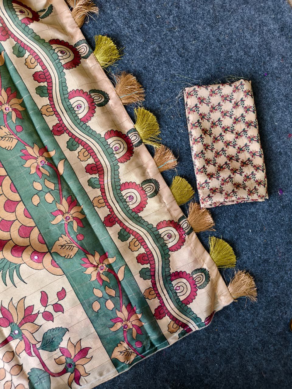 Pure jute crepe fabric saree with kalamkari beautiful prints all over saree with tassels and mirror work