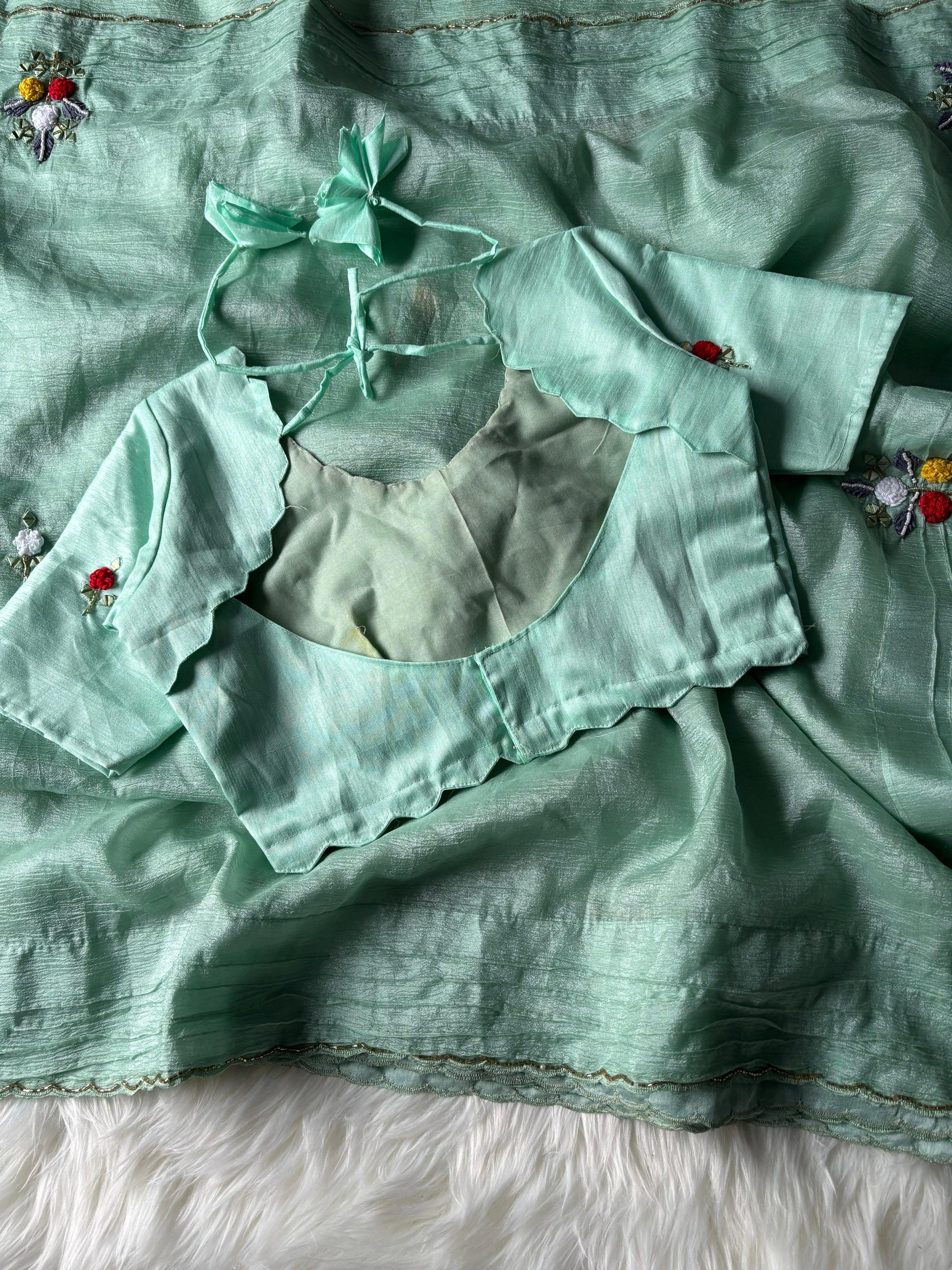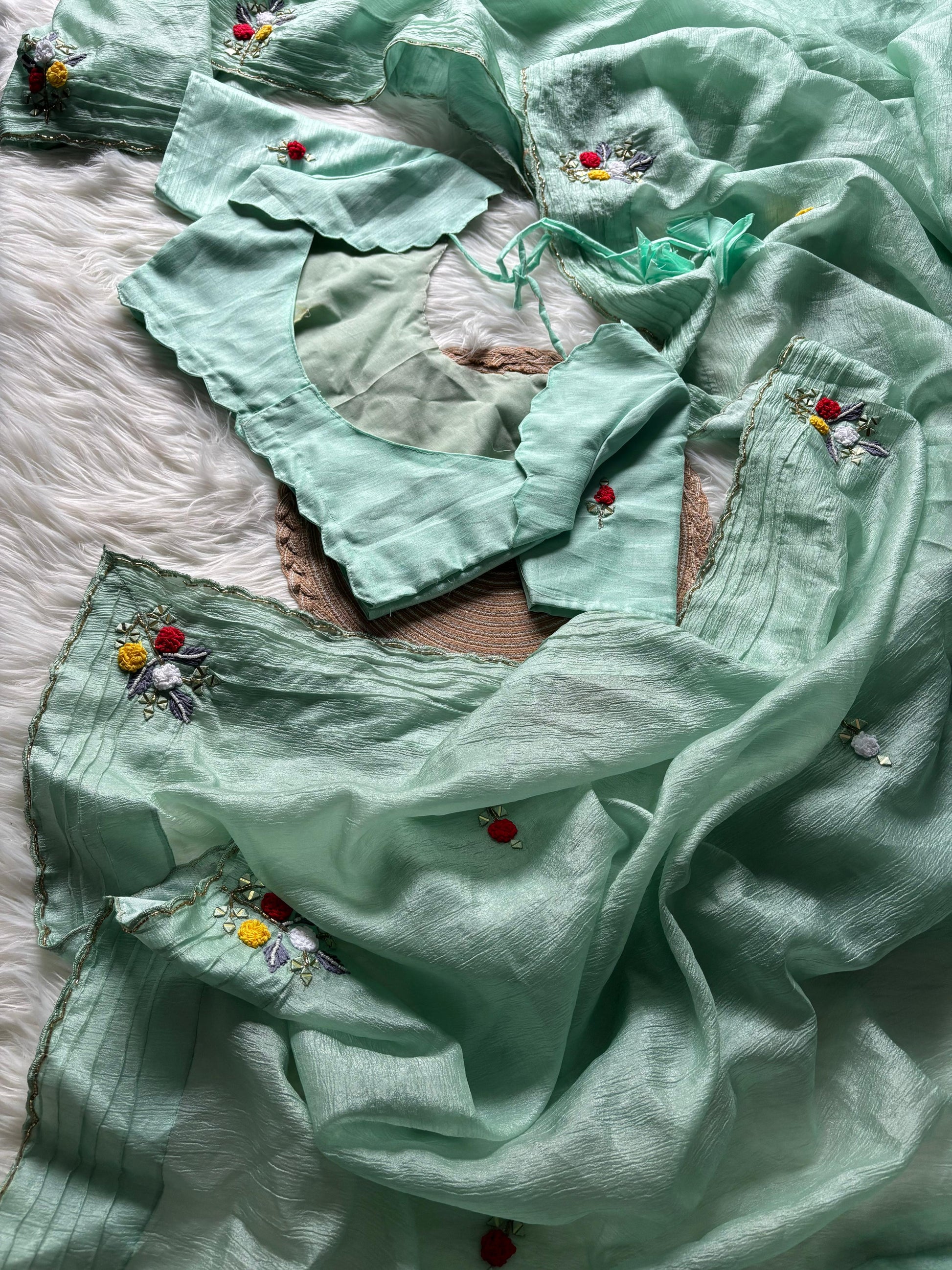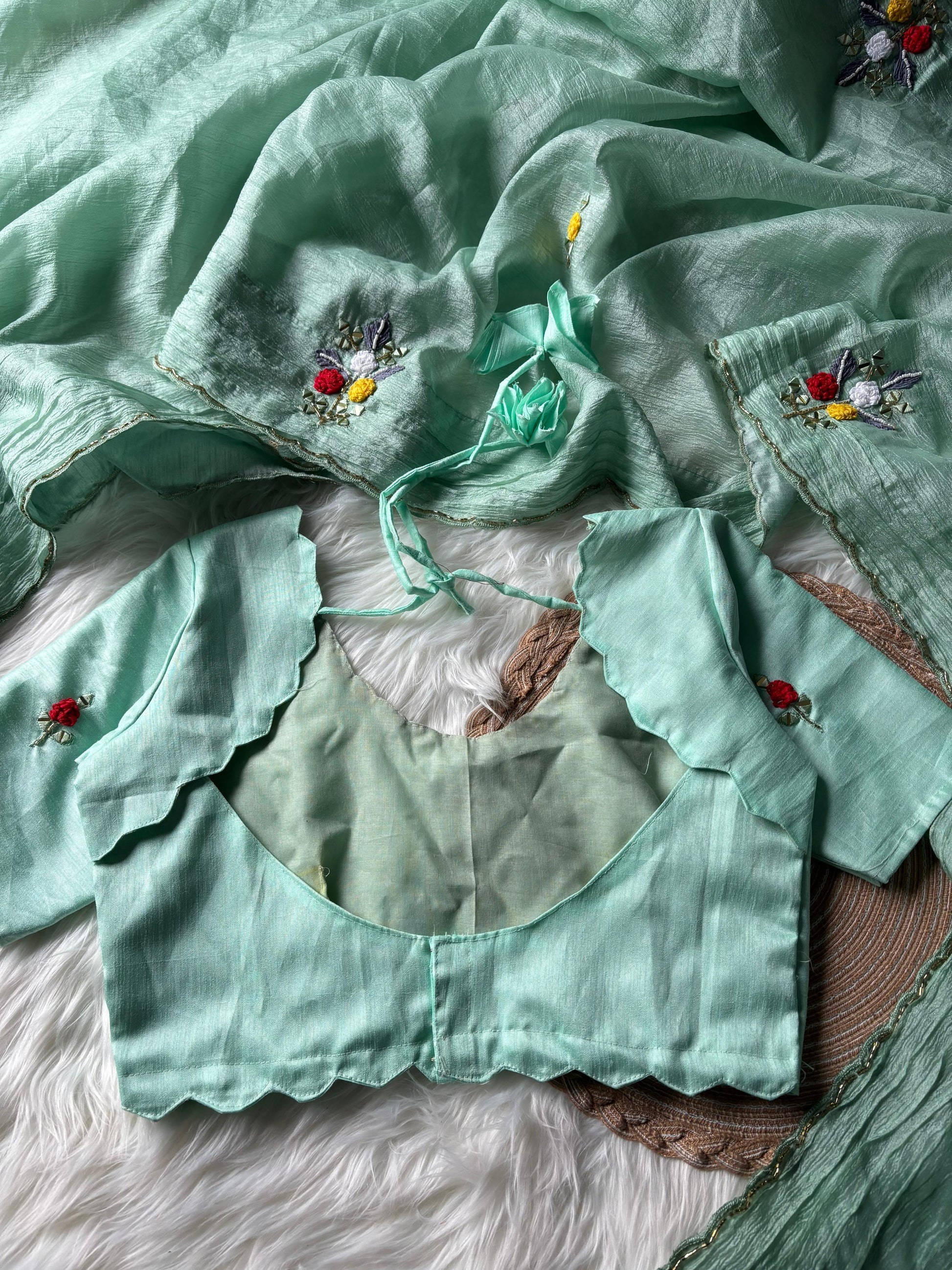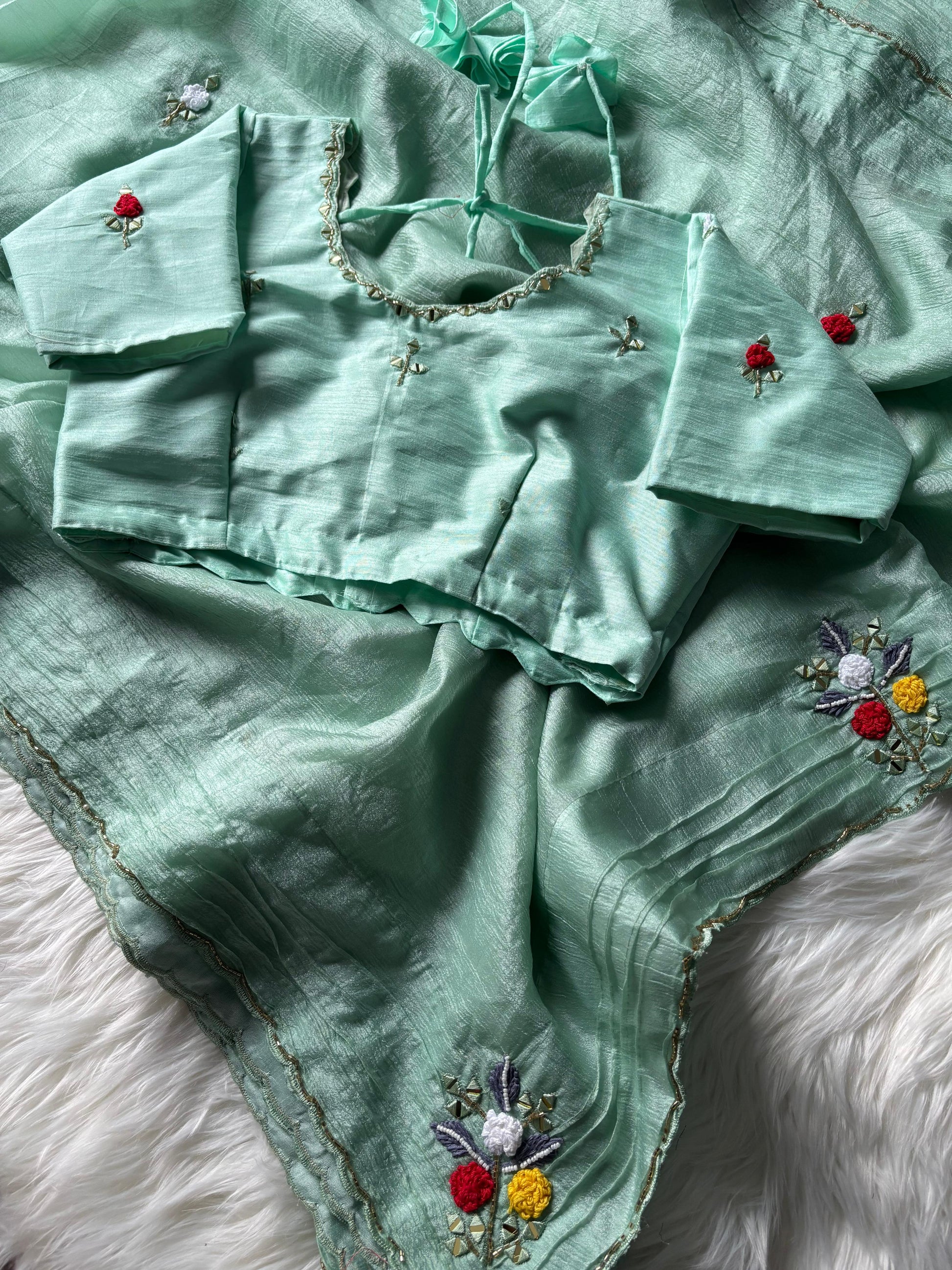Step into elegance with our Candy Crush Saree, featuring exquisite handwork of wool thread, mirror, and beads on a graceful Bentex border and pallu. The saree is beautifully enhanced with cutdana detailing and a delicate cutwork border, adding a luxurious touch.