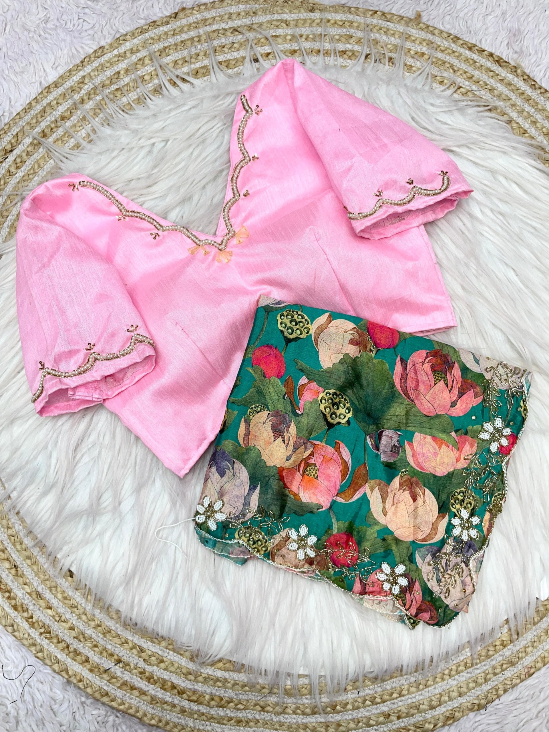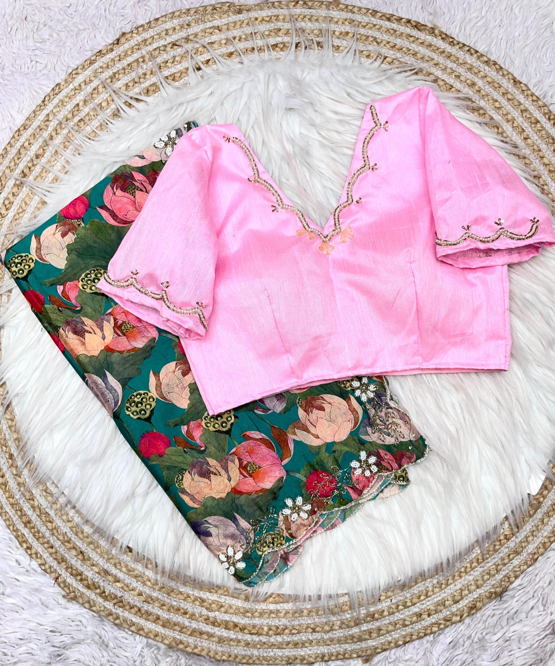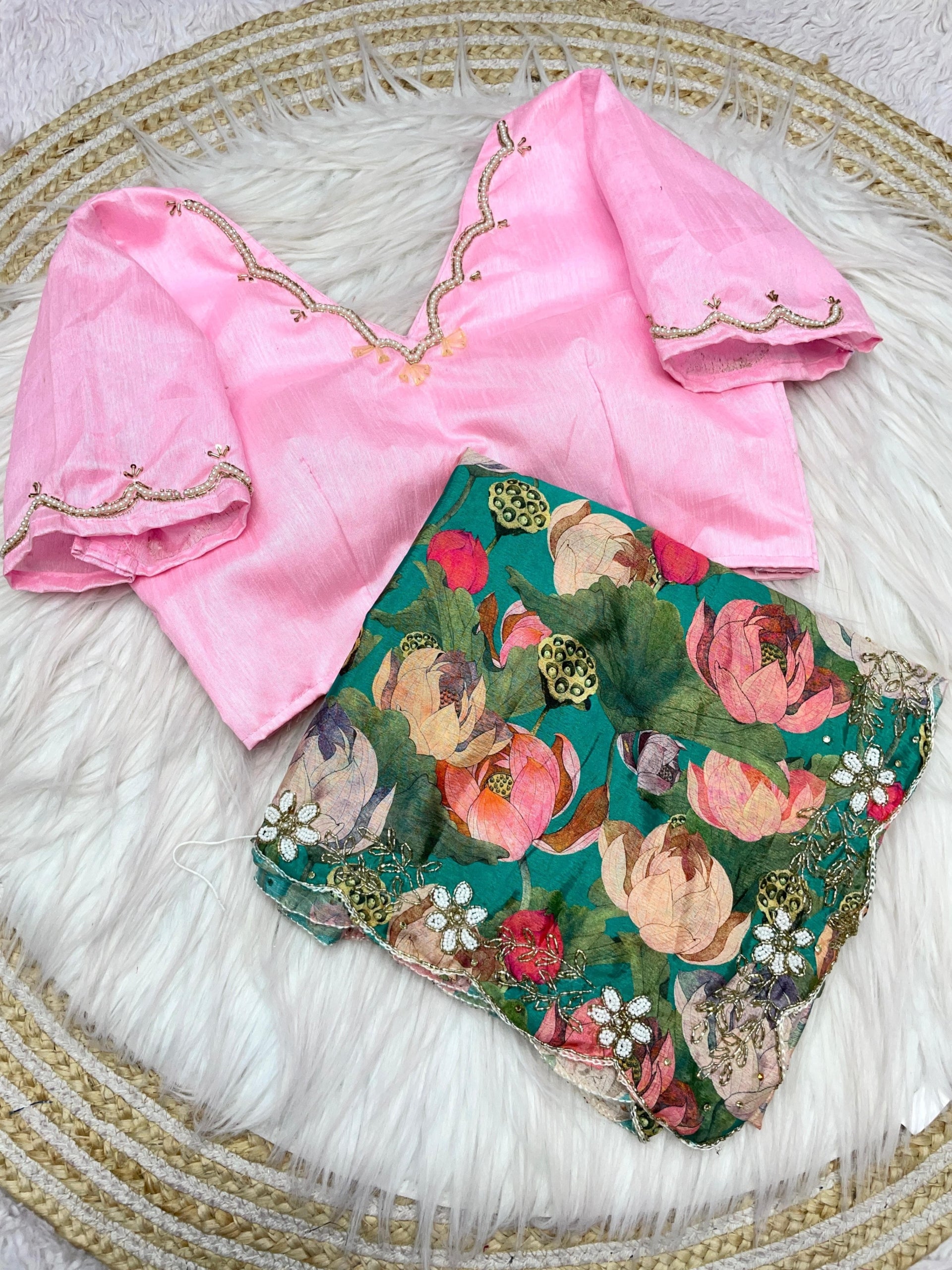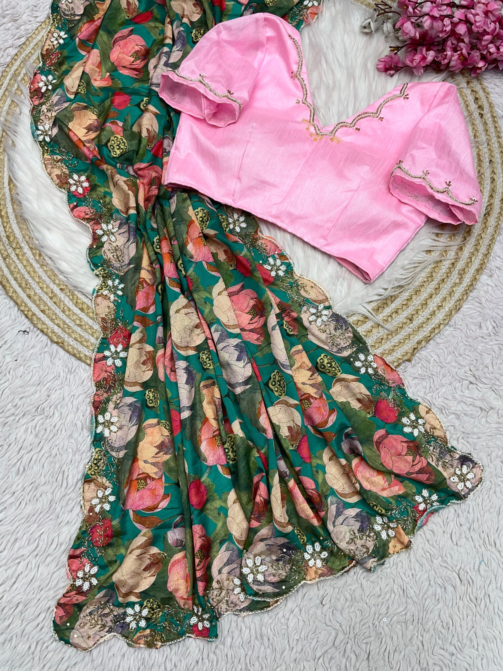 Pure Chinon Saree with flowers digital print all over the saree with premium designer hand khatli work on the border paired with stitched handworked blouse as shown in real pics