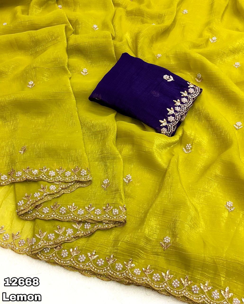 Crunchy Chiffon Crush Silk with beautiful embroidery & moti work scalloped cut work border