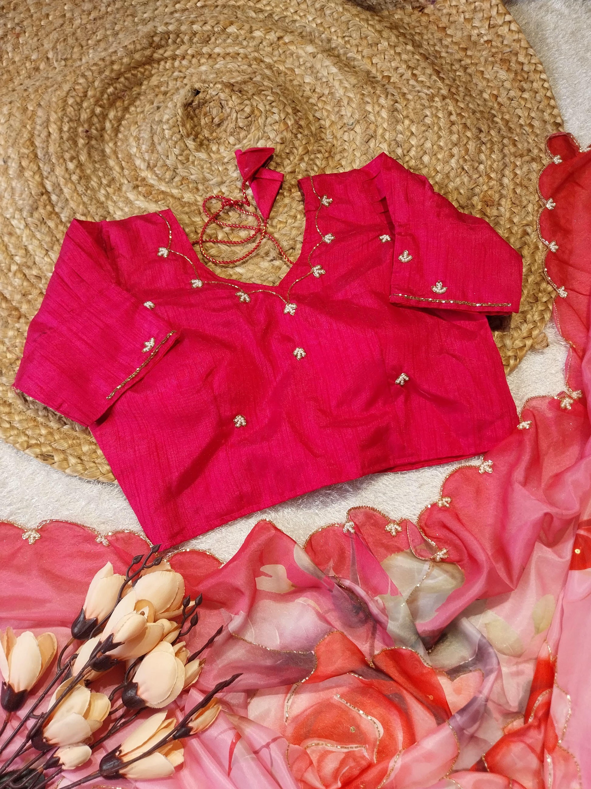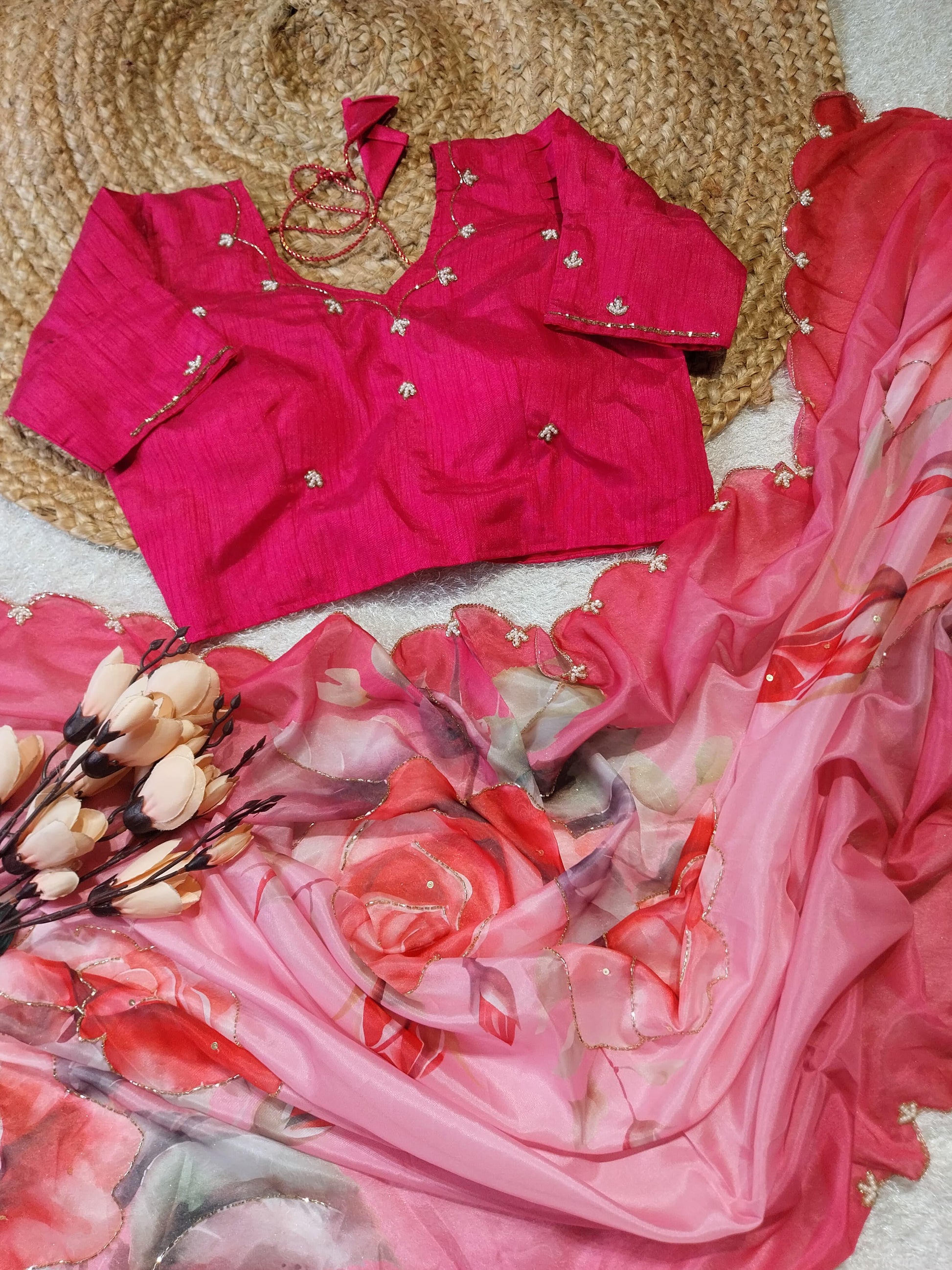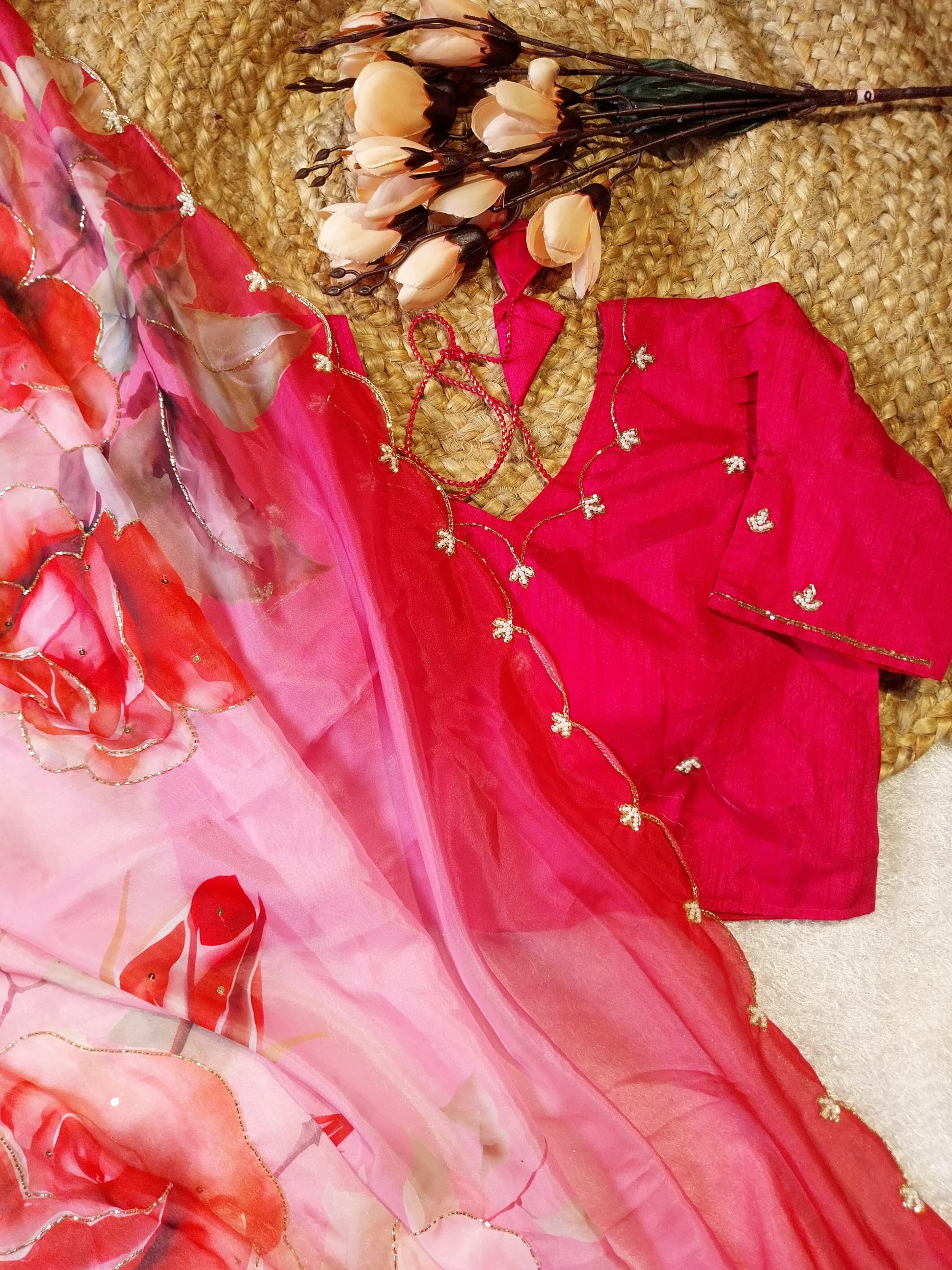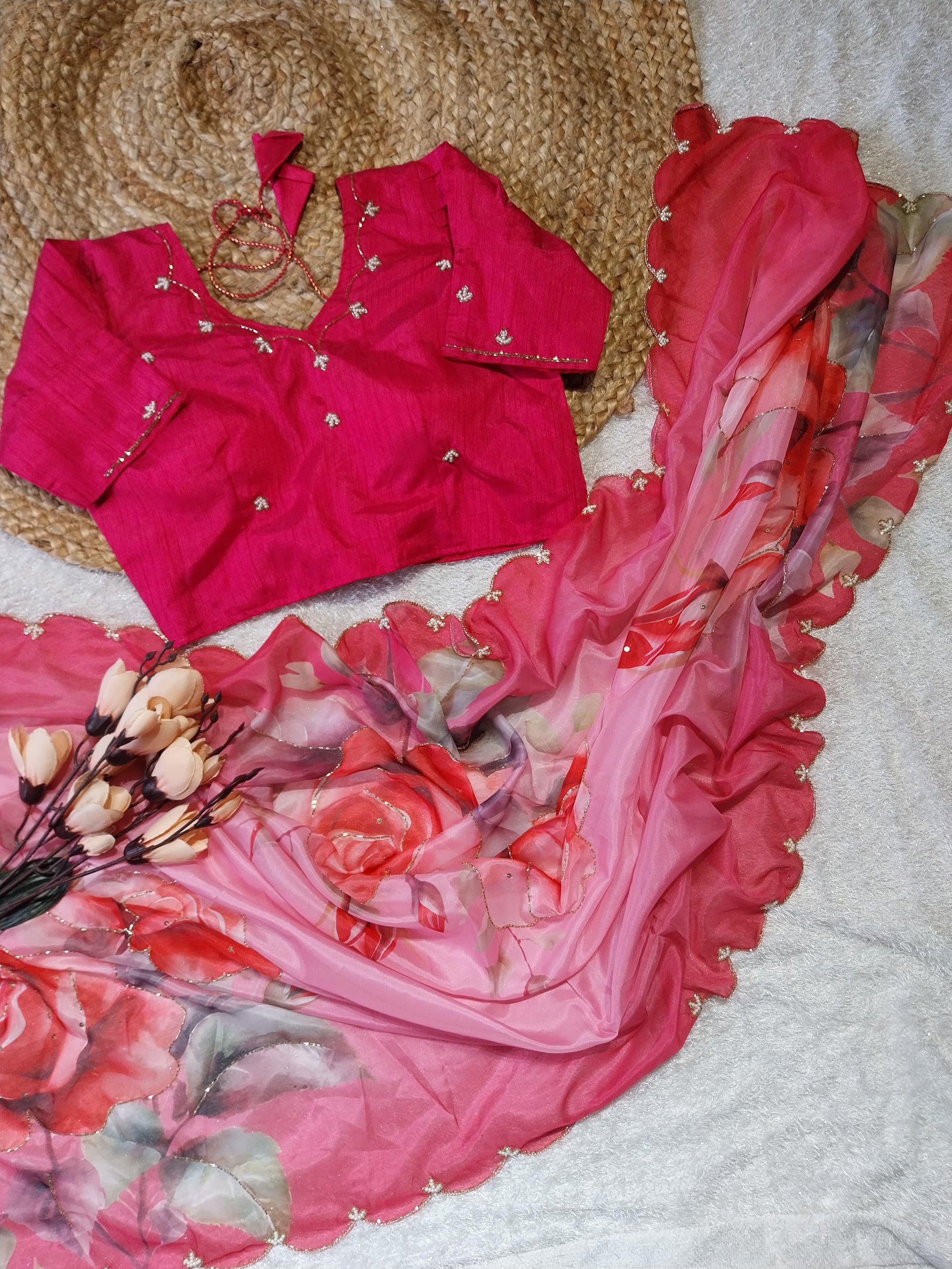 Introducing Our Pure Soft Teby Silk Saree, featuring beautiful digital prints of flowers and intricate hand cutdana work. The heavy outing border adds to its elegance. Complete the look with our pair of silk fabric with khatli work stitch blouse 38 free size. Experience luxury and style in one saree.