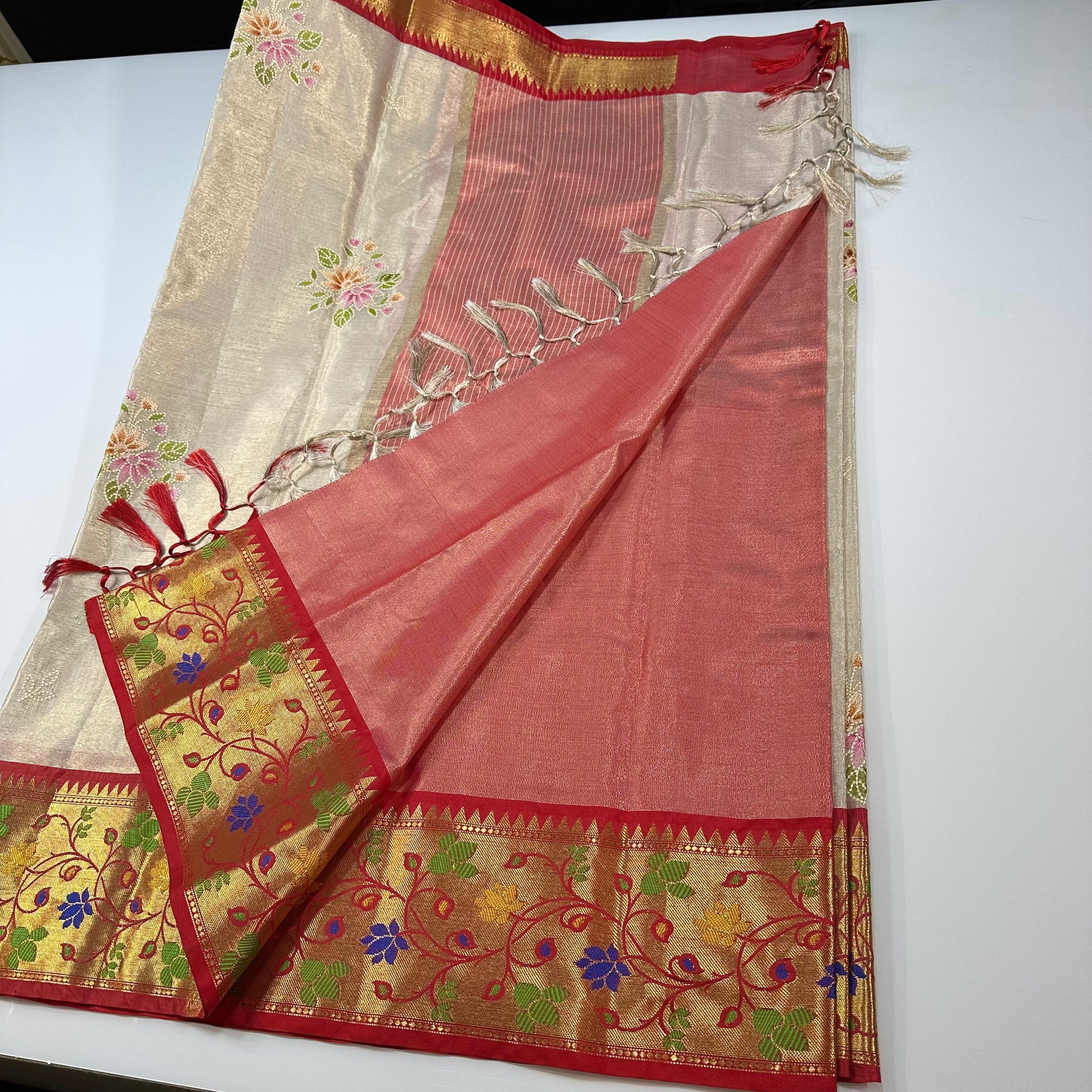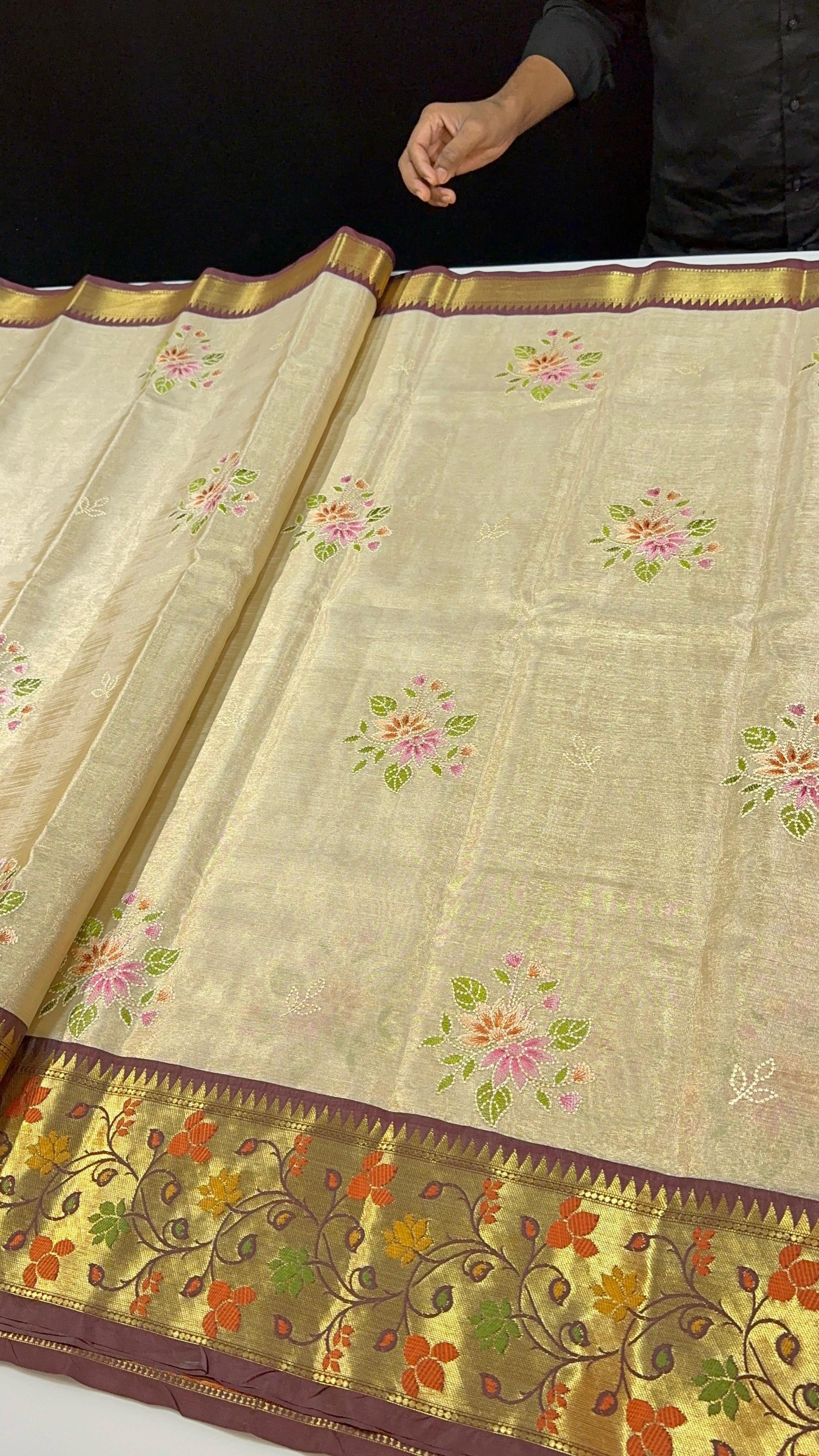 Bringing you all the premium soft Banarasi tissue silk saree in rich weaving paithani border along with an exclusive embroidery work meena buta over body