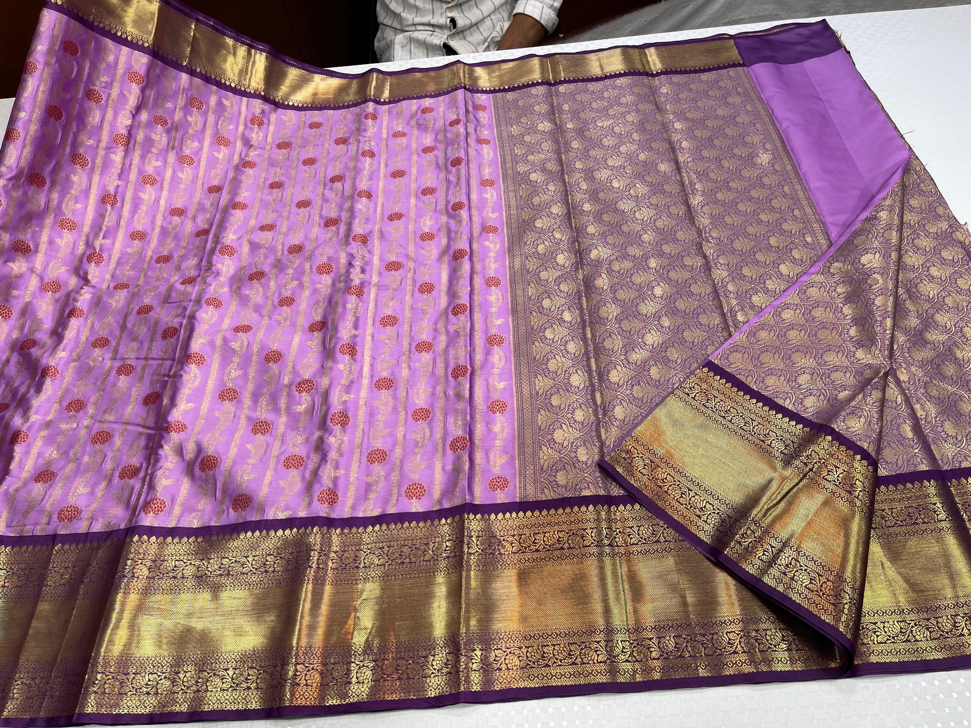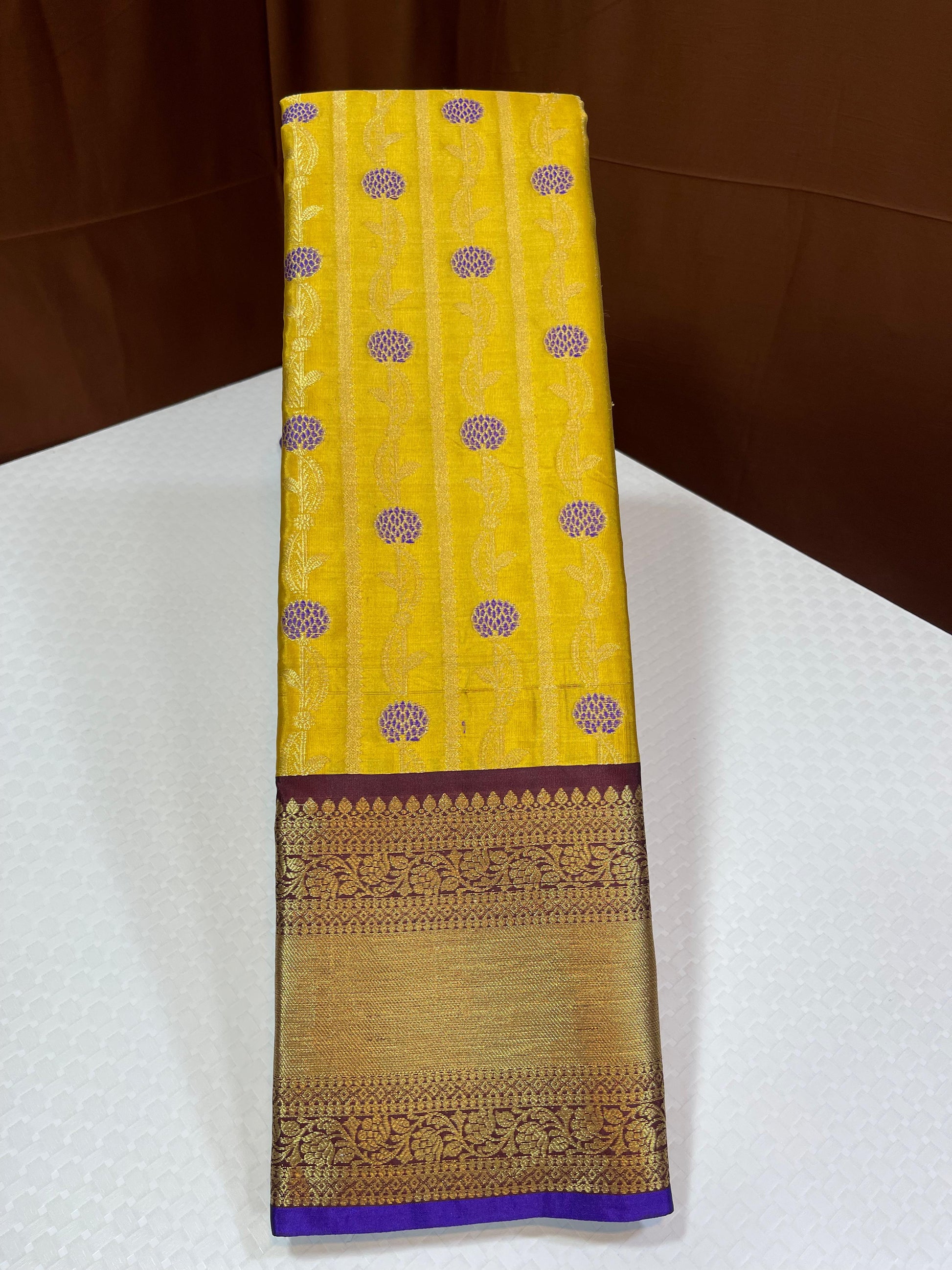Bringing you all the premium soft semi-Kanchi brocade saree in all new contrast border concept with the kanchi border combined with meenakari butas allover including zari pallu as well