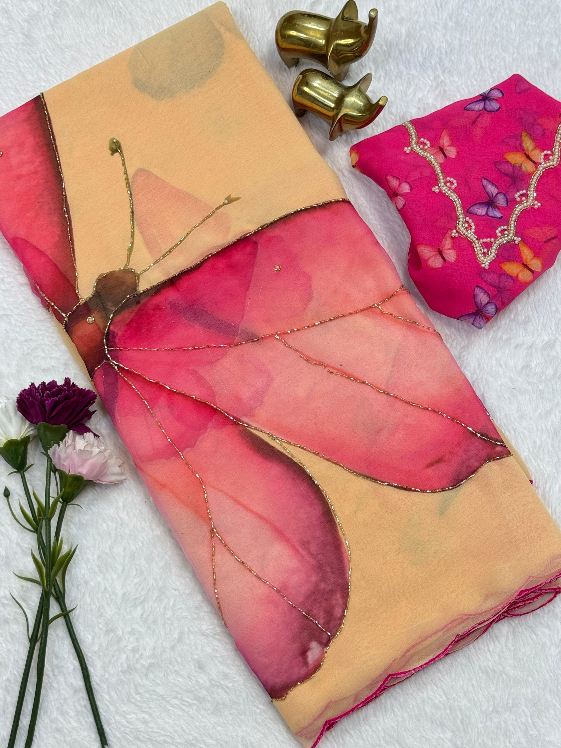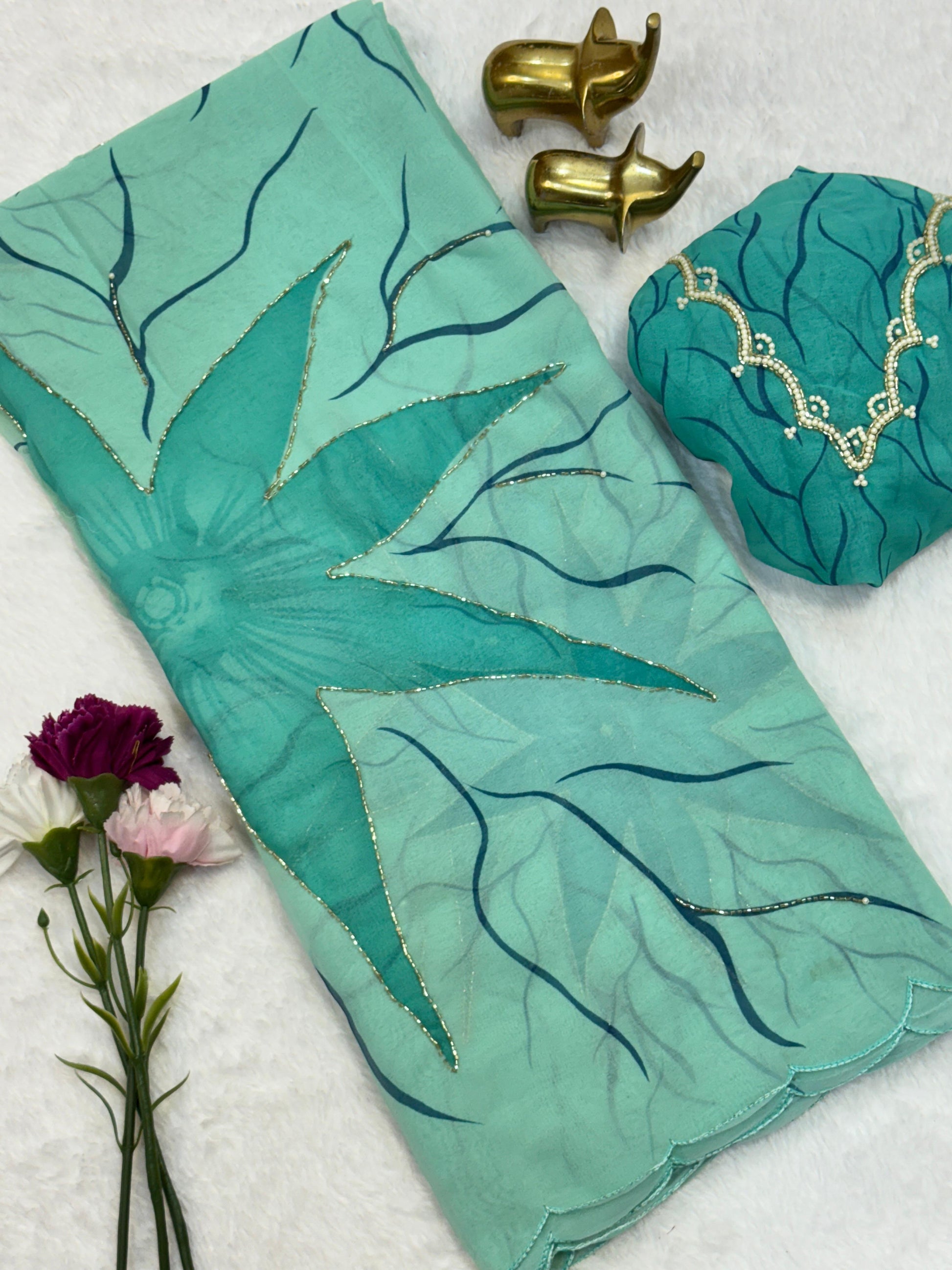 Soft & smooth weightless chiffon floral digital print with beautiful handwork and Arco lace border