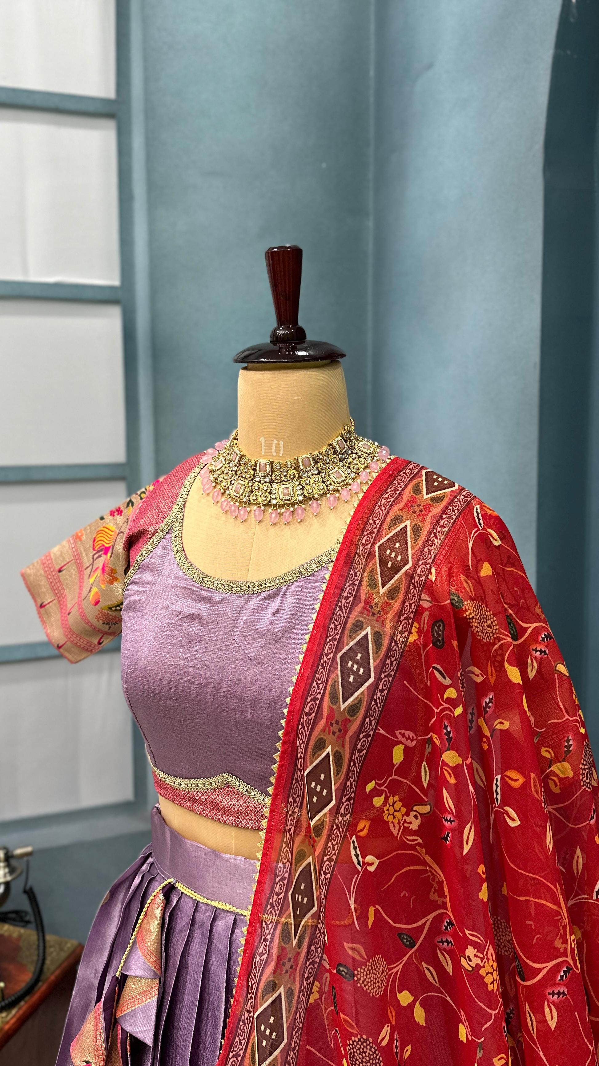 This exquisite two tone l tissue silk with Paithani silk border lehenga showcases a harmonious blend of vibrant colors and luxurious fabric. The lehenga features a stunning border that elegantly frames the flowing silhouette, enhancing its overall appeal. Perfect for festive occasions or weddings, this attire combines traditional craftsmanship with contemporary style, making it a must-have addition to any wardrobe. The soft silk material ensures comfort while exuding sophistication, allowing the wearer to make a striking impression.
