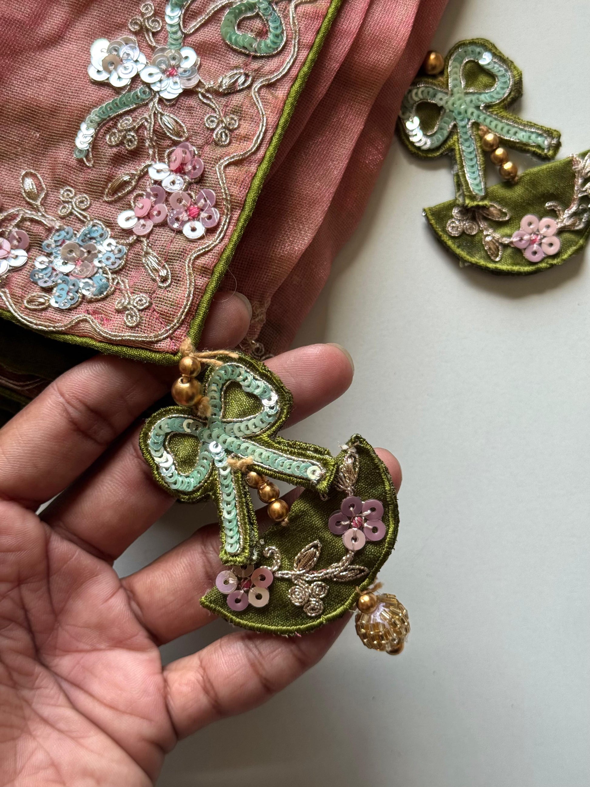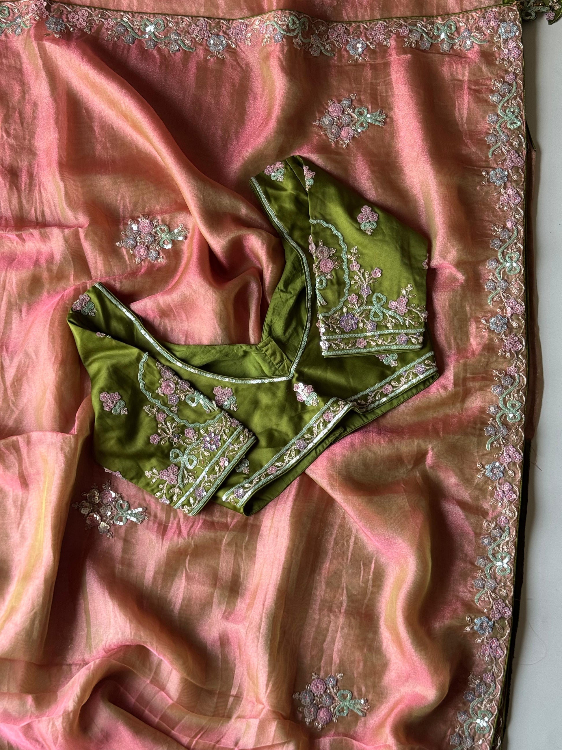 Made from luxurious tissue silk, this saree features intricate coding work and multi-color sequence throughout. The scalloped coding work on both sides adds a touch of elegance, while the contrast piping and designer tassels complete the look. Comes with a fully multi-sequence worked blouse for a stunning ensemble.